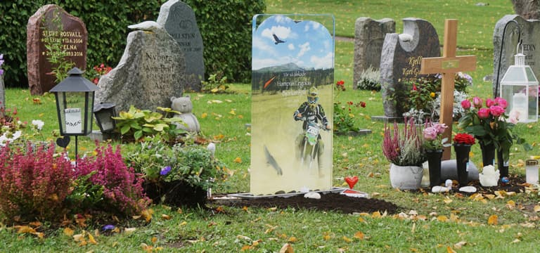 En gravsten i glas är ett vackert och personligt alternativ till en traditionell gravsten, den upplevs som ljus, lätt och unik. När solen lyser reflekteras ljus och skuggor på det transparenta glaset på ett effektfullt sätt. Det vackra motivet är ljusbeständigt och är lika fint på gravstenens båda sidor.